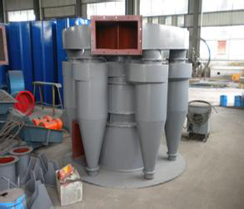 4、经直笼型转子分级后细颗粒随循环风进入外部各个旋风集尘器内。由于新设计的旋风集尘器进风口加设了导风板,在内锥筒增设了反射屏,下端增设了减速板,从而使旋风集尘器流体阻力大幅下降。循环风在导风板作用下,以较高的风速进入旋风收集器。在蜗牛角扩大部分风速突然降低,加速颗粒沉降,也提高了旋风集尘器的集尘效果。