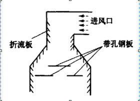 工作原理:当带有粉尘颗粒的废气进入进风口后,气流冲击在折流板上,然后分散到品字布置的导流板上,进入除尘器内。带尘气流不仅从板的孔中通过,还从板两侧和并排两块钢板之间的空间通过,这样就很好地分散了气流的方向,减小了气流的冲击力,延长了设备的使用寿命。