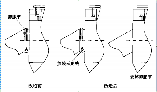 由于改造时间长,影响生产,当时只临时进行了处理,在A处做一铁三角并打上浇注料,后发现表面还有积煤存在,随后在年底大修时进行了C底改造,去掉膨胀节,改后未再发生类似现象。改造前后袋除尘器入口处结构示意见图1。