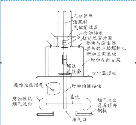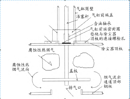 水泥行业的废气中湿度比较高(尤其窑尾除尘器处理的废气),为了防止布袋除尘器在使用中因为结露而造成粉尘糊袋的现象,一般要求布袋除尘器的废气温度在80℃以上。另外袋收尘上原装配置的气缸提升阀的活塞杆长度比较短,气缸提升阀的活塞杆直接与风道盖板相连接,而且气缸提升阀前端盖密封圈安装后靠近除尘器顶盖,在使用过程中活塞杆会将烟气的热量通过热传递的方式传递到密封圈处,造成密封圈的疲劳损坏,密封圈损坏后就会造成气缸提升阀漏气。