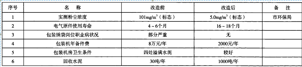 因为该水泥厂包装除尘系统的成功改造,得到了合肥水泥设计院及兄弟单位的好评。同时设计院对中国联合水泥集团下面几个正在设计的粉磨项目(板桥中联、响水中联等)进行了更改,重新设计。目前水泥厂包装除尘系统改造投入使用已经有3年多了,两个兄弟单位的包装除尘系统改造都已经有2年了,使用效果都比较理想。改造前后效果对比见表1。