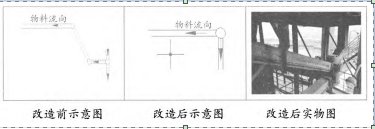 (2)入磨斜槽拐弯较多,形不成初速度造成物料堆积而堵料,通过改造减少斜槽转弯2处,见图2。