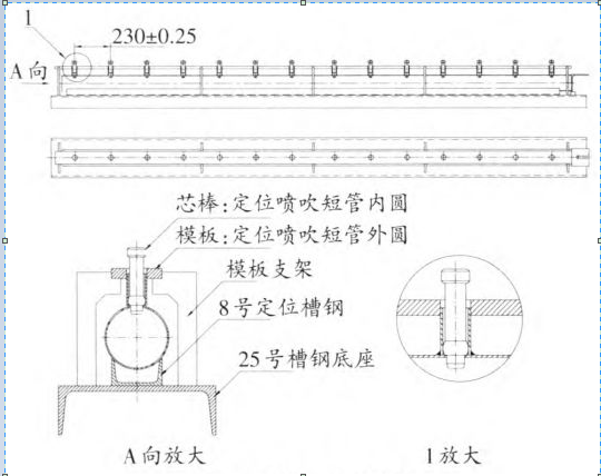 工作时,将喷吹管从图2的左端插入工装,放上模板,将喷吹短管放入模板的定位孔内,再在喷吹短管内插入芯棒,芯棒全部插到位后即可进行H接喷吹短管,Z后焊定位角钢座。H接结束后,依次拔出芯棒,取下模板,向右抽出喷吹管组件即可。