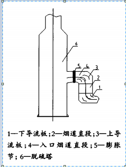 脱硫系统入口烟道因工艺布置需要,布置形式见图2,利用流场模拟进行了校复,认为气流分布易导致部分浆液翻卷,为此对其内部二个直角弯处增设了导流板,见图2,破除了紊流现象,让气流较平滑地导入脱硫塔。