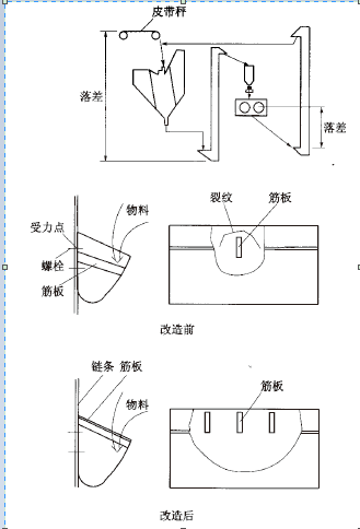 由于物料的落差无法改变,只能从料斗材质和结构这两方面加以改造。