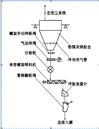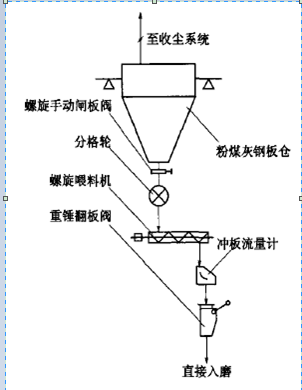 每套磨房设一D立的粉煤灰喂料系统,工艺流程见图1。主要设备为称重仓、下料分格轮、调速螺旋喂料机和冲板流量计。粉煤灰经过冲板流量计进行计量后,根据偏差情况动态自动G踪调节螺旋喂料机的转速从而保证维持设定的配料量。