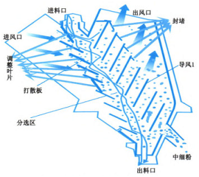 (2)对进风区导风叶片进行调整,出风口部分叶片进行封堵,加长打散区,有X控制用物料在打散区充分分散,并保证底部区域分选风压,提高分选效率,从而控制入磨物料细度。附改造后风料通过示意图和V选内部结构数据,见表2、图2。