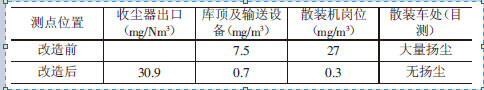 (1)通过对水泥散装系统综合收尘改造,散装库顶平台、水泥散装车处及收尘出口粉尘大大降低,达到国家卫生和环保标准的要求(见表2)
